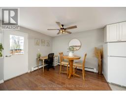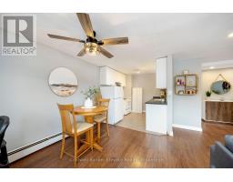 $565 MonthlyCute as a button and completely move-in ready, this 1 bedroom, 1 bathroom condo is ideally located in one of the best spots in town, just steps to downtown Georgetown, shops, and the local Farmers' Market. The bright and functional layout begins with a welcoming front foyer featuring ceramic tile flooring, a flush mount light, and a double mirrored closet offering ample storage. The living room showcases laminate flooring, recessed pot lights, a sunny south facing window, and a walk out to the balcony with open south facing views. The open concept dining area continues the laminate flooring, features a ceiling fan with integrated light, and shares access to the balcony, creating a seamless indoor outdoor living experience. The kitchen offers ceramic flooring, a mosaic tile backsplash, laminate countertops, a double stainless-steel sink, track lighting, and an open concept design ideal for everyday living. The spacious primary bedroom includes laminate flooring and a south facing window that fills the room with natural light. The renovated four-piece bathroom features a modern vanity with sink, updated vanity lighting, and a tub and shower combination with sliding glass doors. Ensuite laundry adds everyday convenience with a Bosch front load washer and dryer included. Additional highlights include one exclusive parking space, visitor parking, bike storage and a private storage locker located in the building. Maintenance fees are all inclusive, covering hydro, heat, and water. Ideally located close to schools, parks, and minutes to GO, this is the perfect opportunity for first time home buyers. (id:51194)